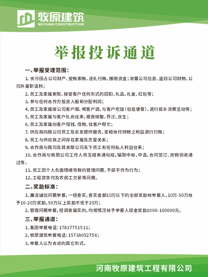 以制度透明筑牢防線,以監(jiān)督機(jī)制激發(fā)自覺。牧原建筑明確表示:廉潔誠信不僅是合作的“硬門檻”,更是企業(yè)公民的社會(huì)責(zé)任。對違規(guī)合作商堅(jiān)決實(shí)施“一票否決”。同時(shí),全面開放舉報(bào)通道,設(shè)立“廉潔誠信踐行獎(jiǎng)”(內(nèi)外獎(jiǎng)勵(lì)標(biāo)準(zhǔn)一致),構(gòu)建全員參與的監(jiān)督網(wǎng)絡(luò)。此舉旨在推動(dòng)合作商從“被動(dòng)合規(guī)”轉(zhuǎn)向“主動(dòng)履責(zé)”,使廉潔誠信內(nèi)化為行業(yè)發(fā)展的共同文化基因。